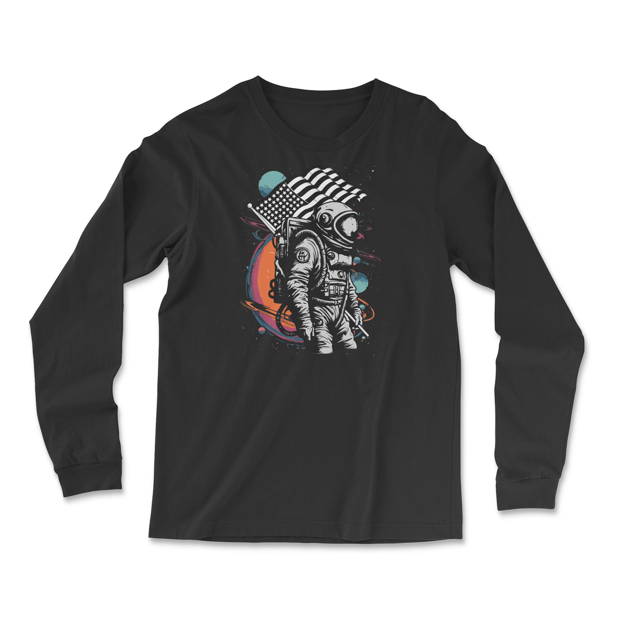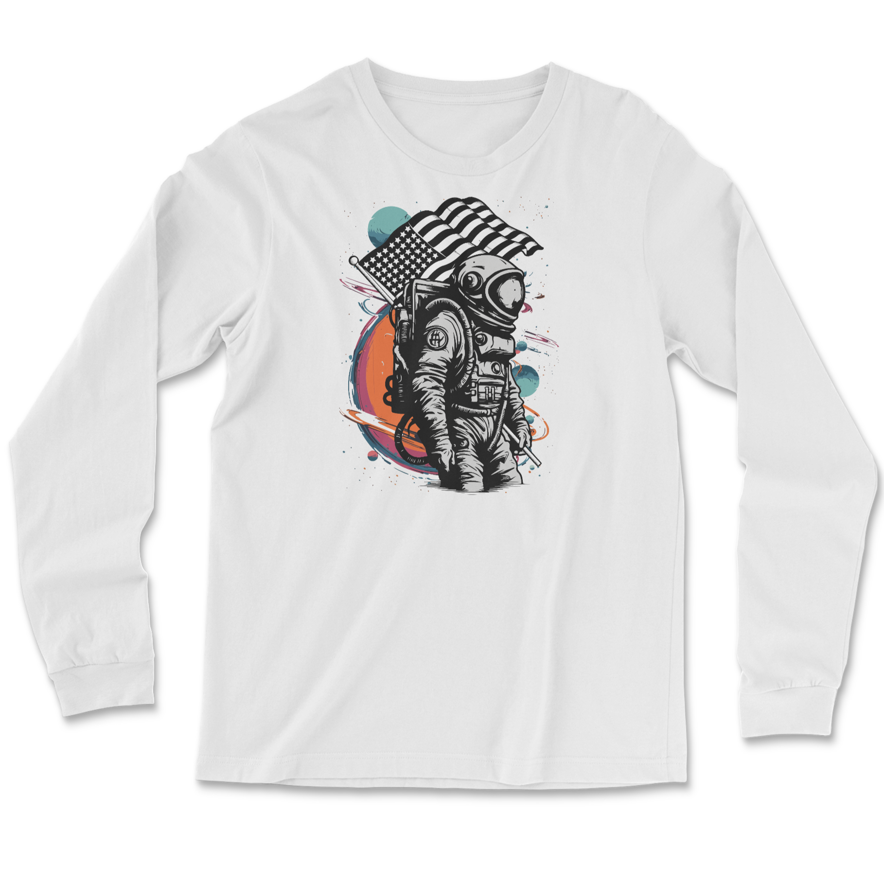 The "Cosmic Valor Long Sleeve Shirt" captures the essence of heroism in the cosmos. With its detailed astronaut and flag design, this piece is a tribute to the bold and the brave, wrapping you in warmth and inspiration. Ideal for cooler days or star-gazing nights, it's a celebration of exploration and patriotism.