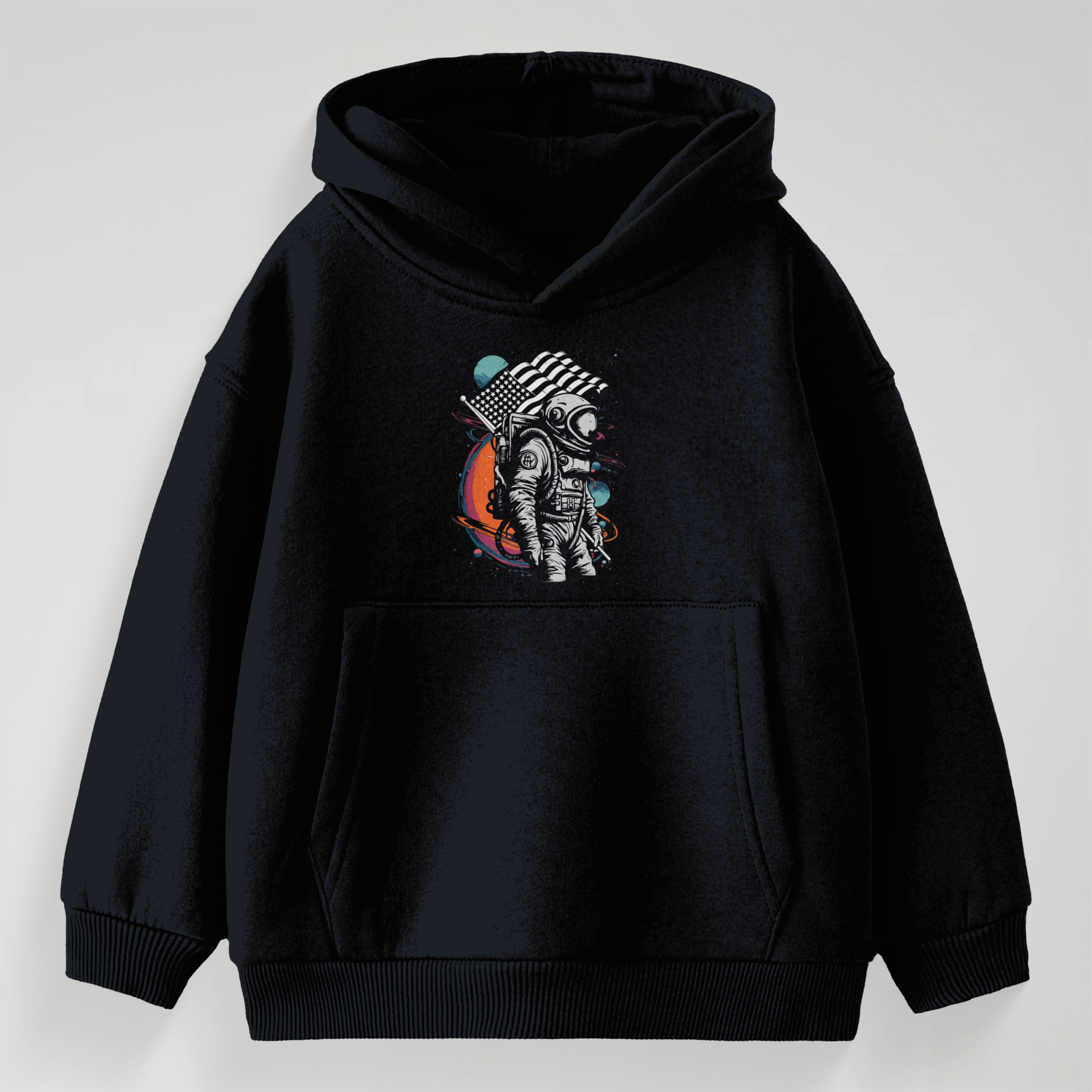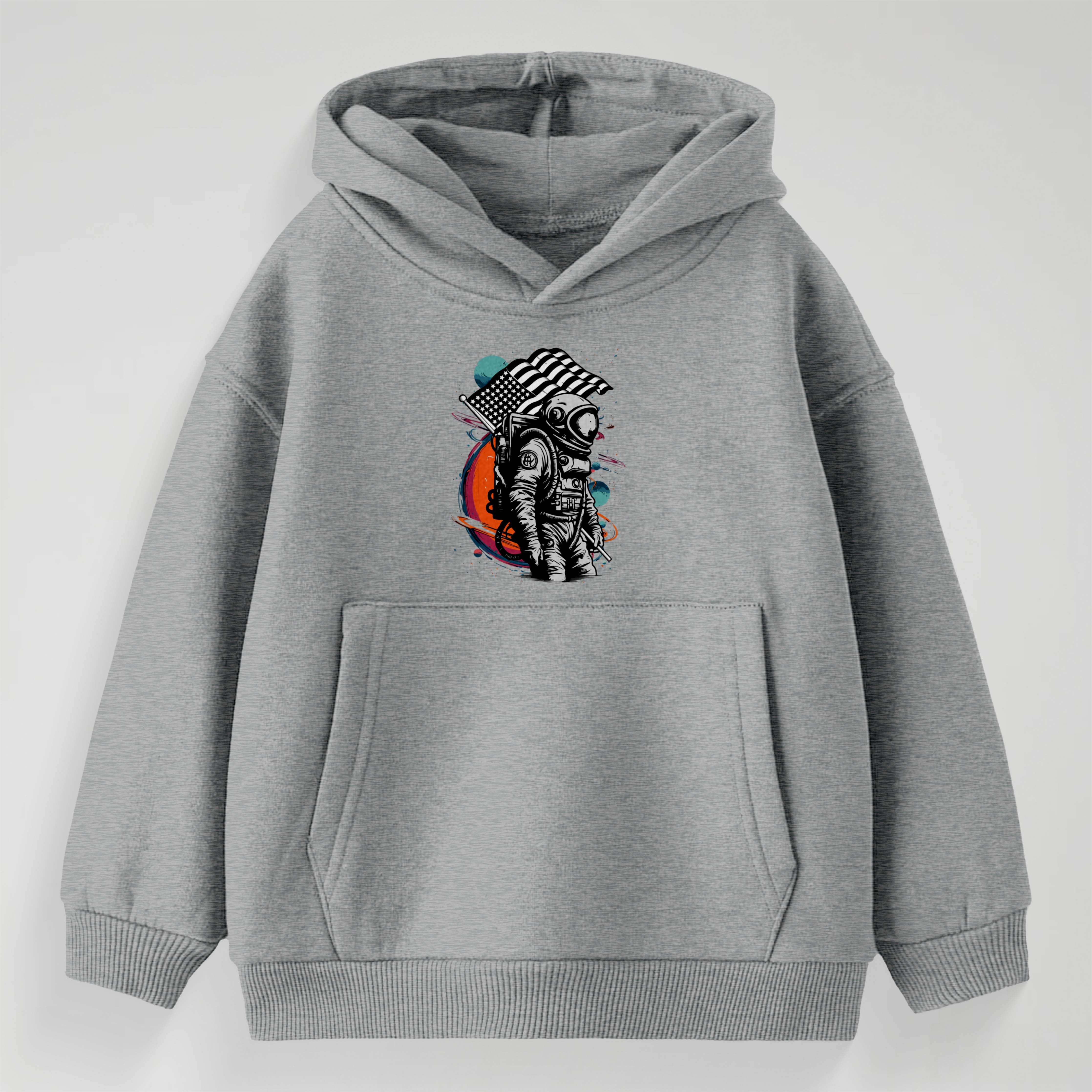 The "Cosmic Valor Toddler Hoodie" is designed to keep your little ones warm and filled with wonder. With its astronaut and flag imagery, it nurtures early interest in space and the virtues of bravery and exploration. A snug garment for the future explorers of the stars.