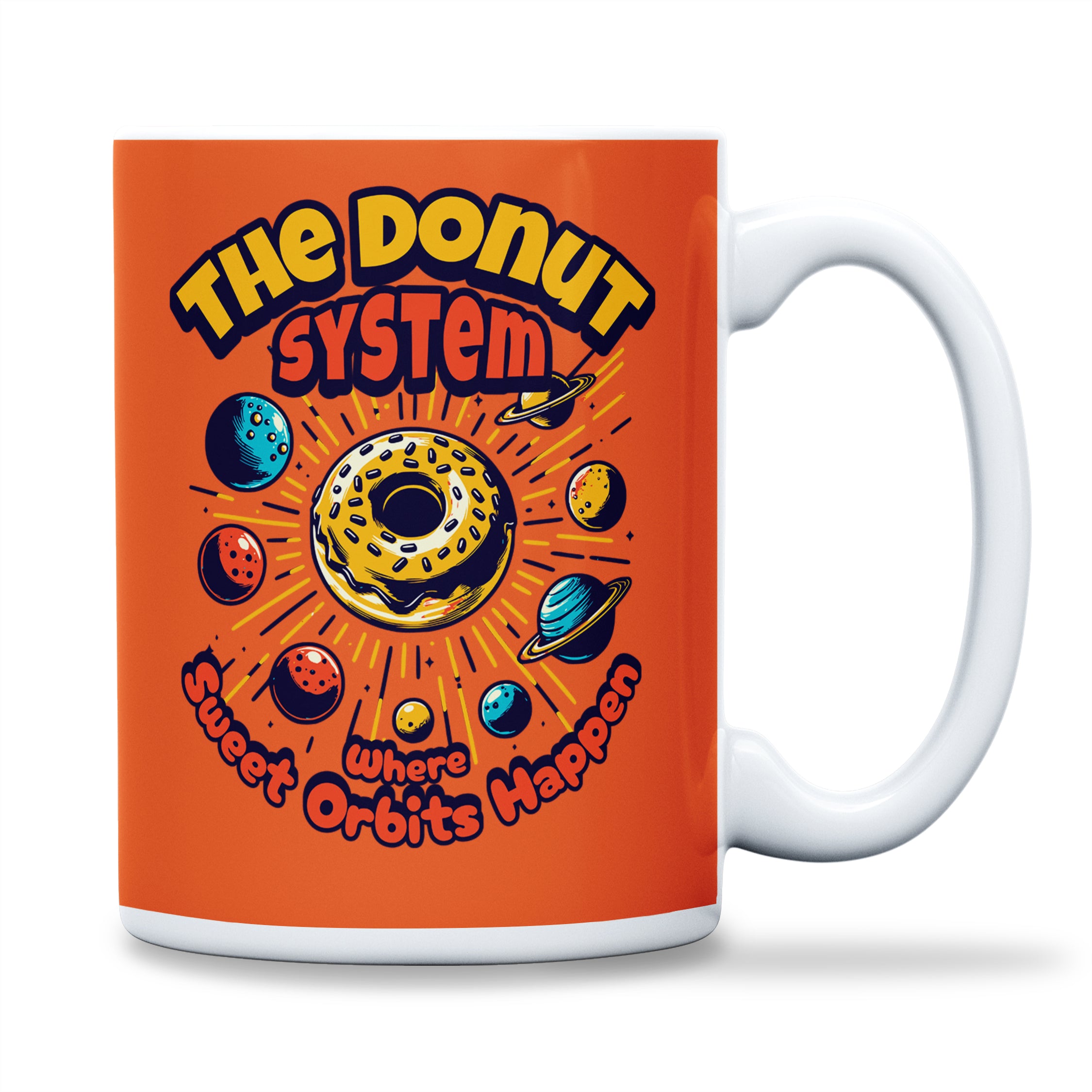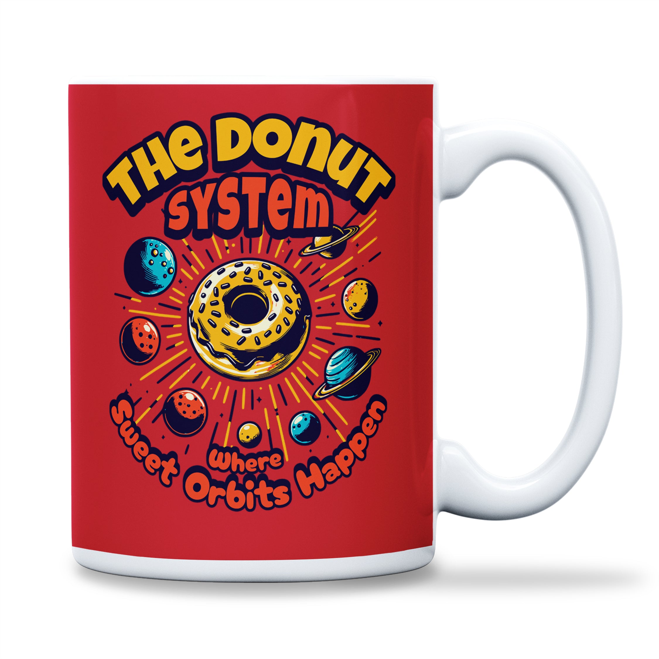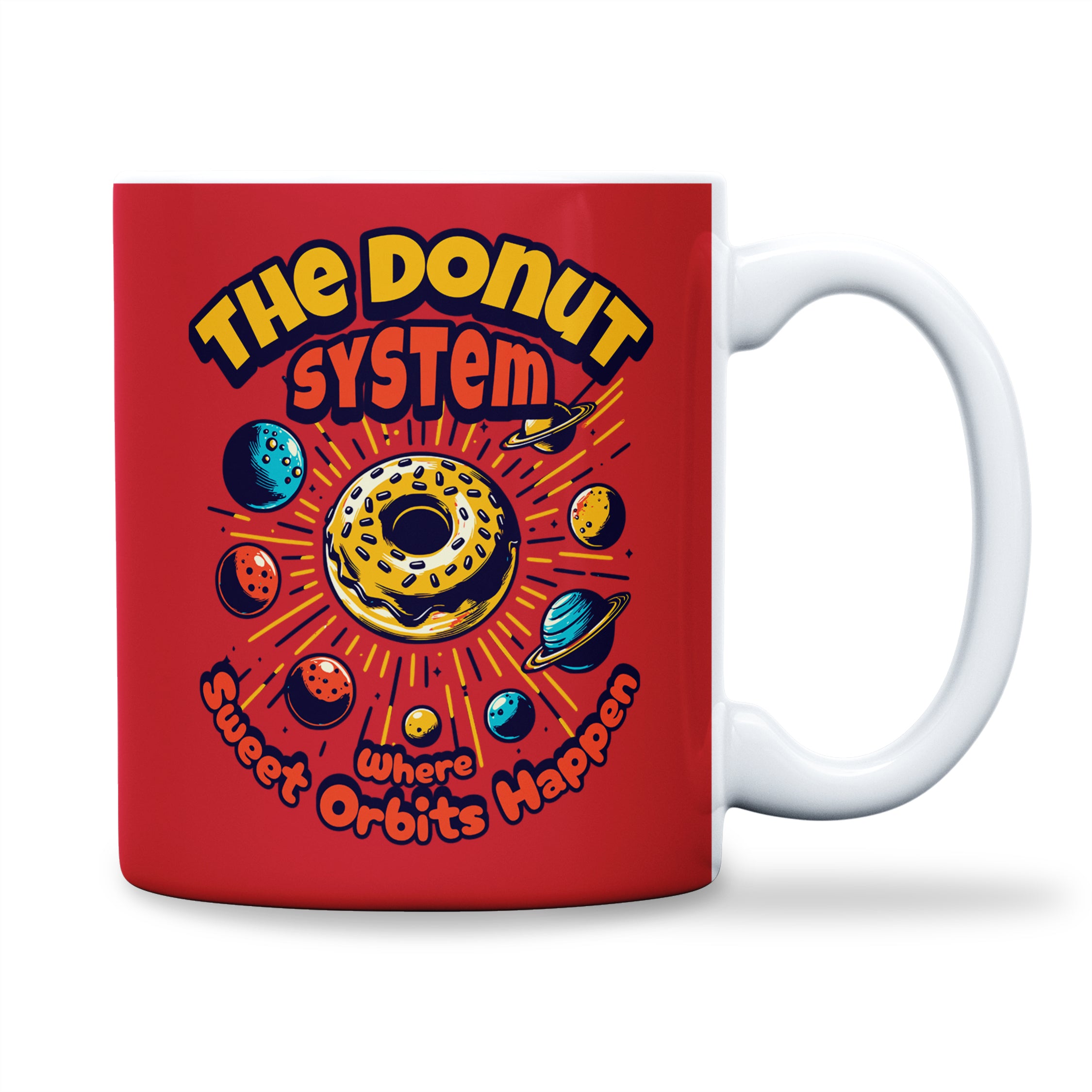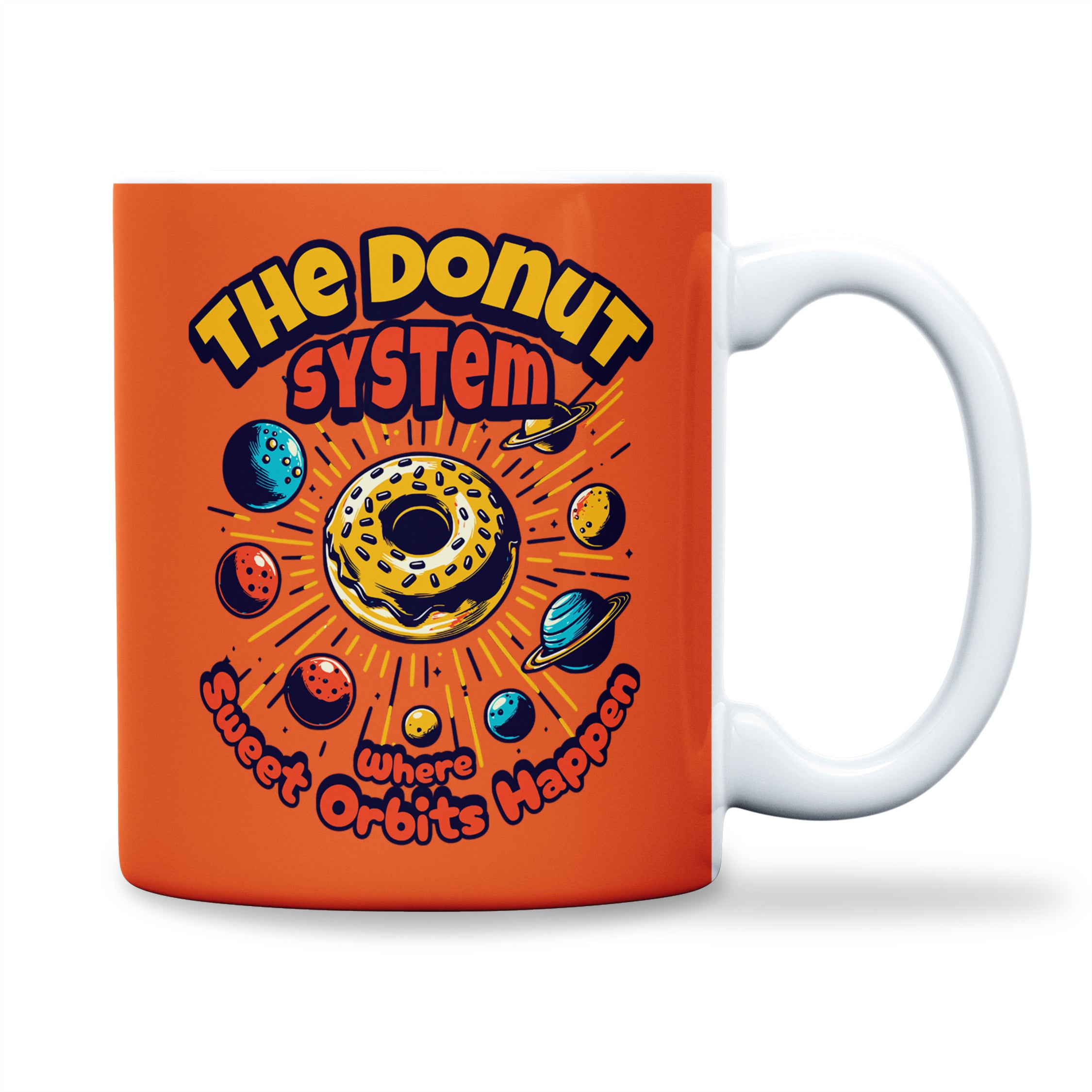 Sip your way through the galaxy with the Donut System Mug. Featuring a unique design where donuts float around as planets, this mug is perfect for coffee, tea, or hot chocolate lovers who enjoy a touch of whimsy with their beverages. It's a delightful way to start your day or enjoy a break, imagining a sweet universe far beyond our stars.