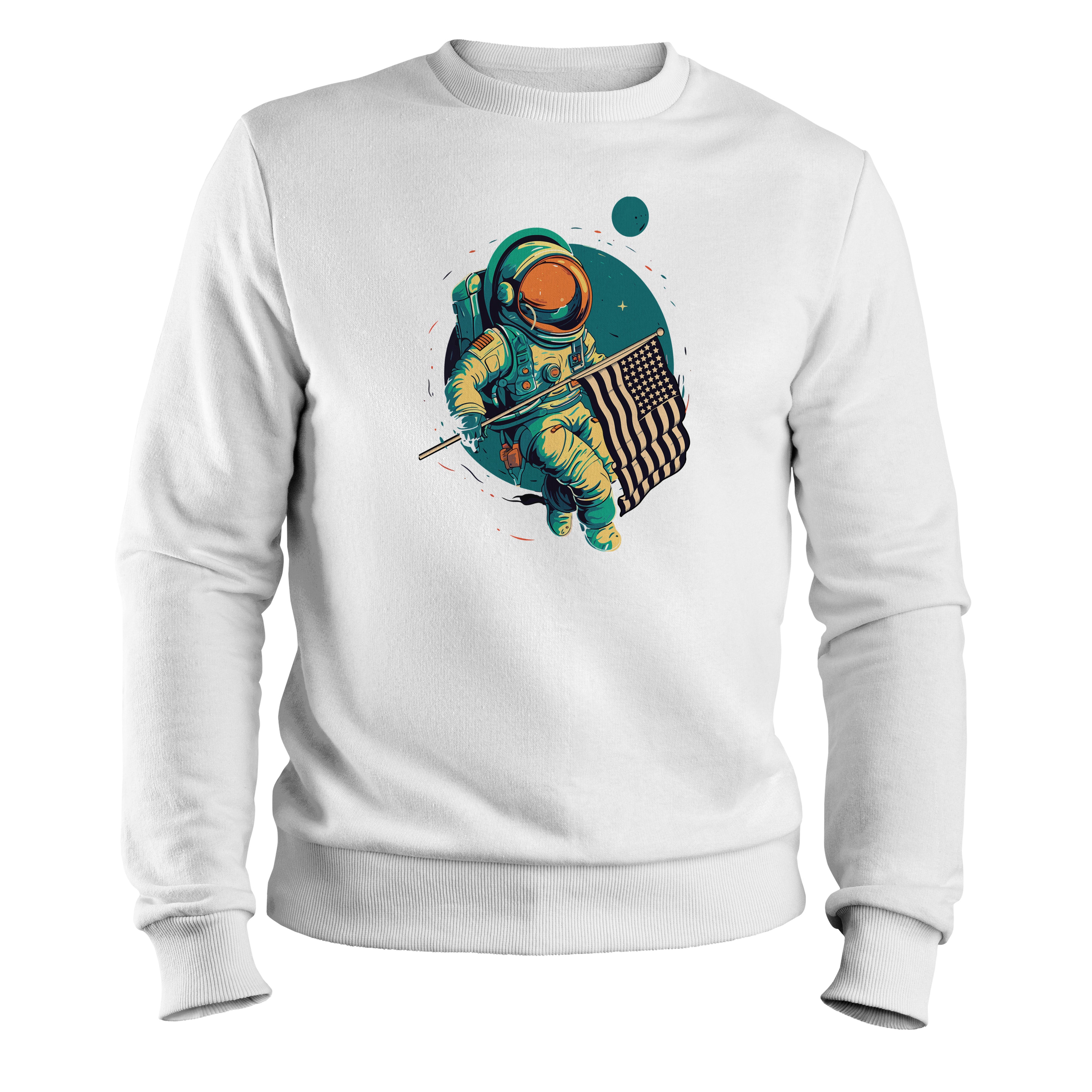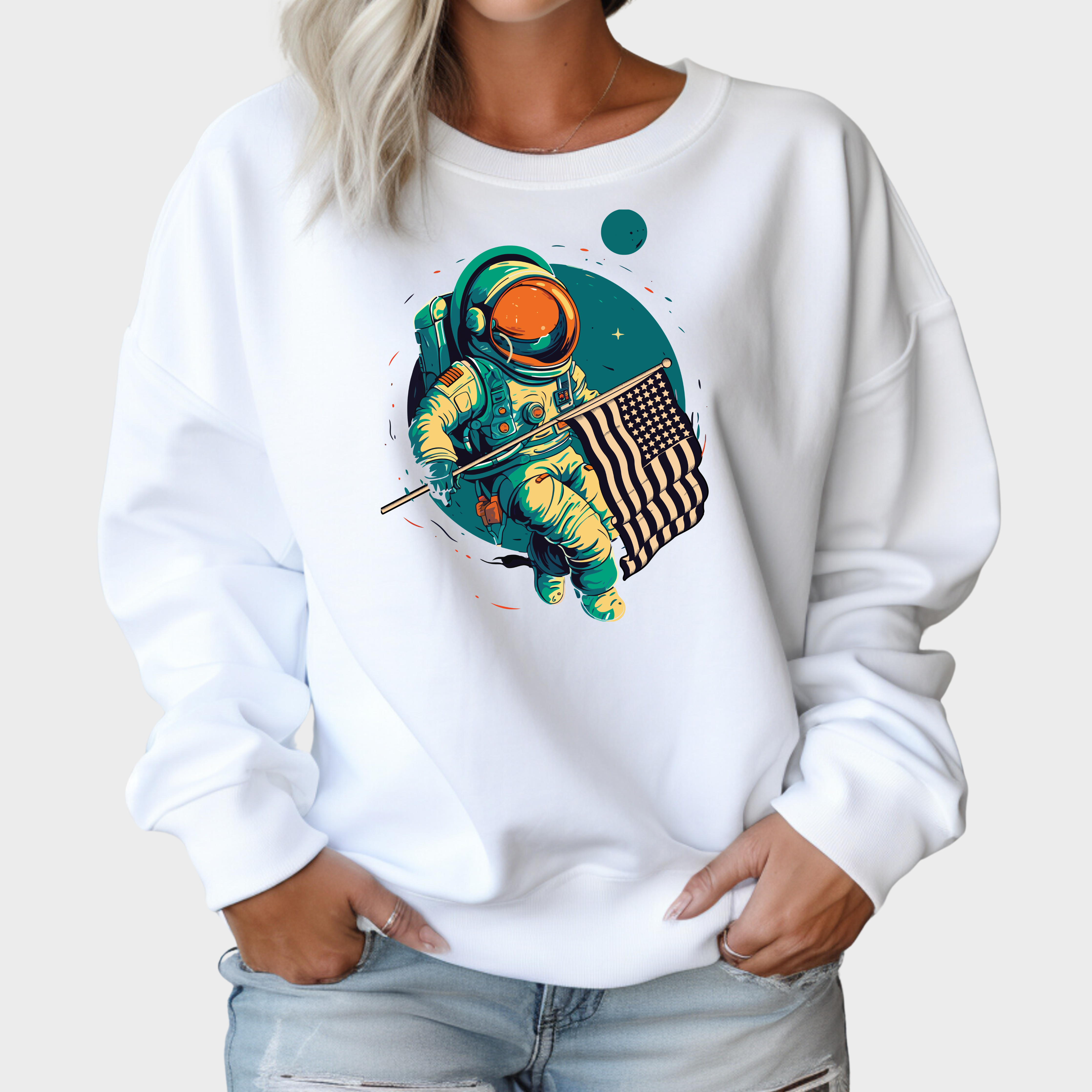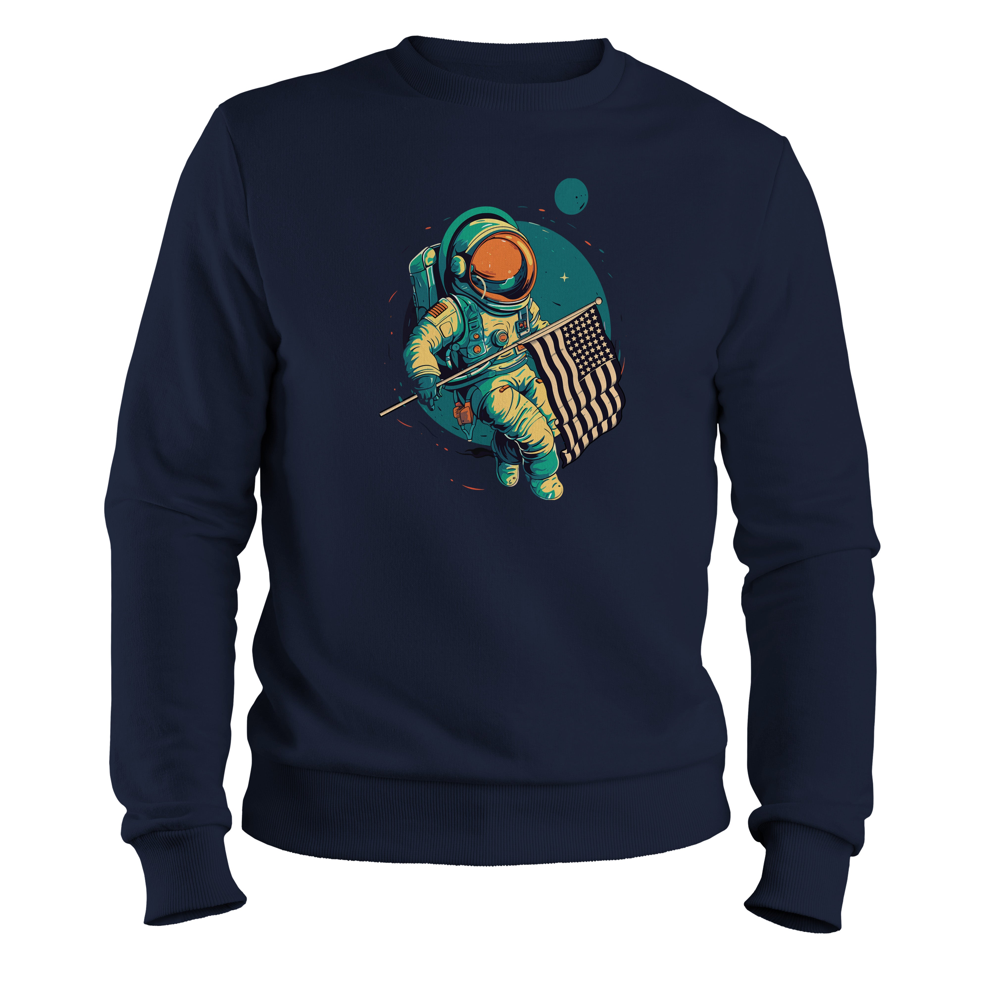 Embrace the chill of space with the warmth of the "Orbital Patriot Crewneck Sweatshirt." This sweatshirt features a serene astronaut with the American flag, blending the thrill of space exploration with a touch of national pride. Cozy for any space enthusiast or patriot.